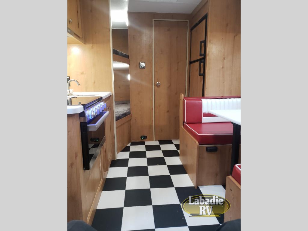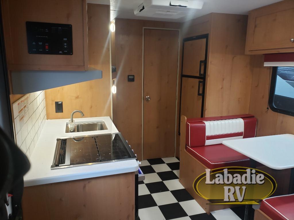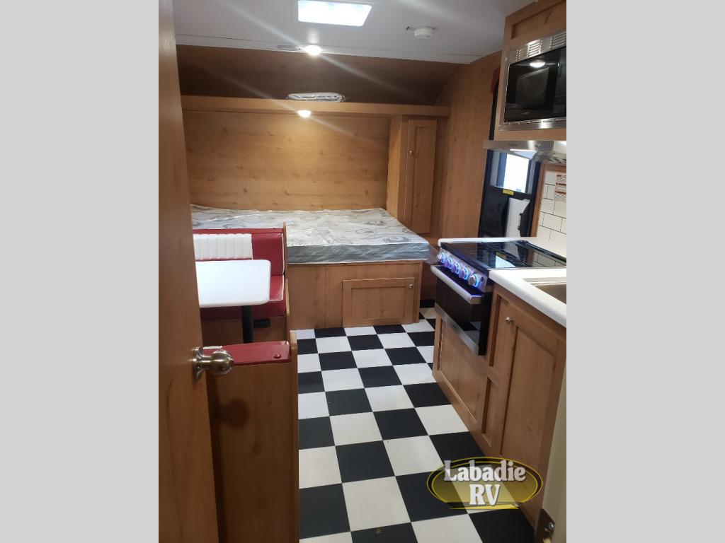 If you've been looking for the perfect family-friendly travel trailer, take a look at this Retro unit. The kids or your friends can claim the bunk beds as their own, and you and your spouse will enjoy the front RV queen bed. There is a convenient full bath with a tub/shower and a power vent to keep everything fresh. Once breakfast is cooked on the three-burner cooktop, you can dine at the booth dinette or take your plate outdoors to sit under the 11' power awning with LED lights.