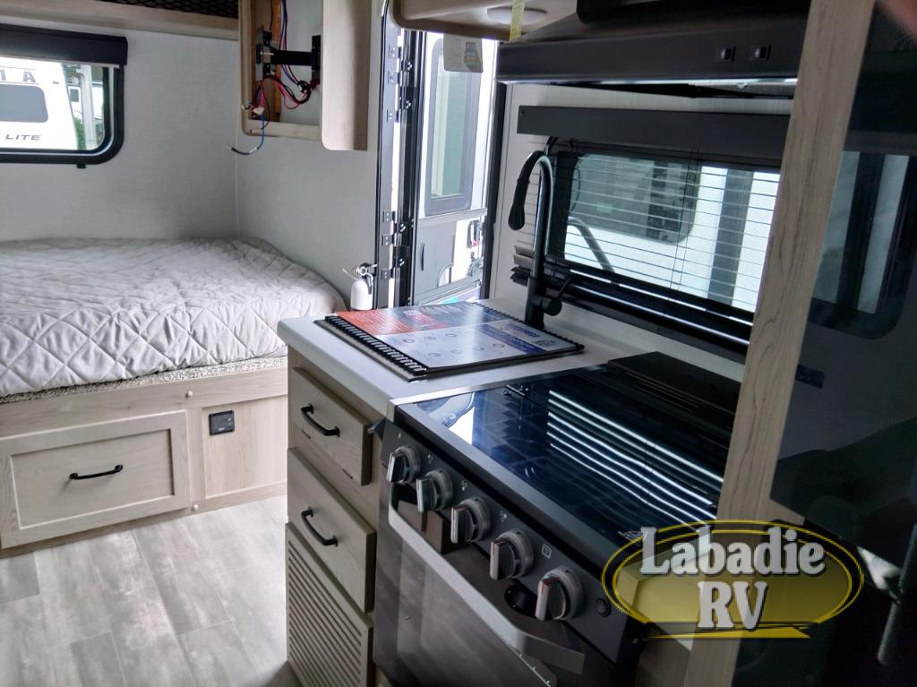 This no slide travel trailer is the perfect lightweight RV for those that love to move around to different campsites. It will be so easy packing up the lawn chairs in the bike door, and there is a rear ladder if you need to clean off the top of your unit. Once you arrive at your destination, put out the 14' power awning, then make lunch on the outside griddle. You will also find a microwave oven and a gas oven indoors and a booth dinette where you dine together. This area can be a sleeping space for a small child or adult, plus there is a full-size bed up front and bunk beds in the back. The optional Power Package available on this model includes three 200W solar panels, a 30 Amp solar charge controller, two Mastervolt smart remotes, and more off-grid features!