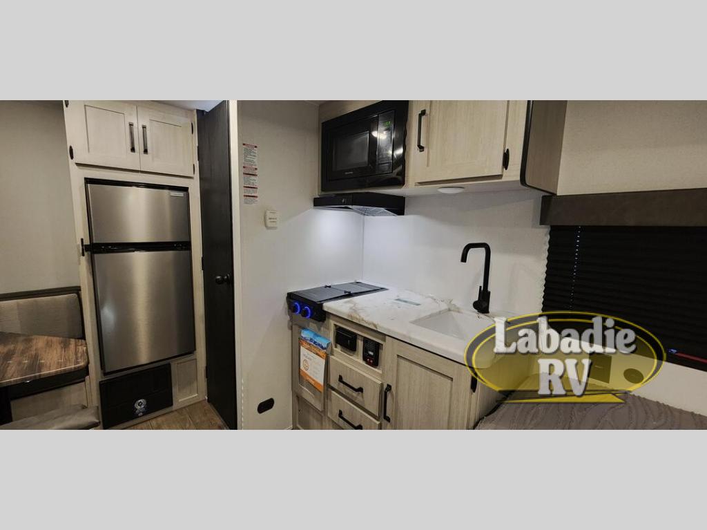 It will be so easy to enjoy camping trips in this single axle travel trailer! There is a front RV queen bed with flip-up storage at the foot of the bed for your belongings, and any additional guests can sleep on the booth dinette with an open shelf above. A full kitchen includes a two-burner cooktop and microwave to cook meals each day, and the 12V black glass refrigerator will keep your food fresh. And a private bath includes a 24" x 32" shower to clean off after a day outdoors!