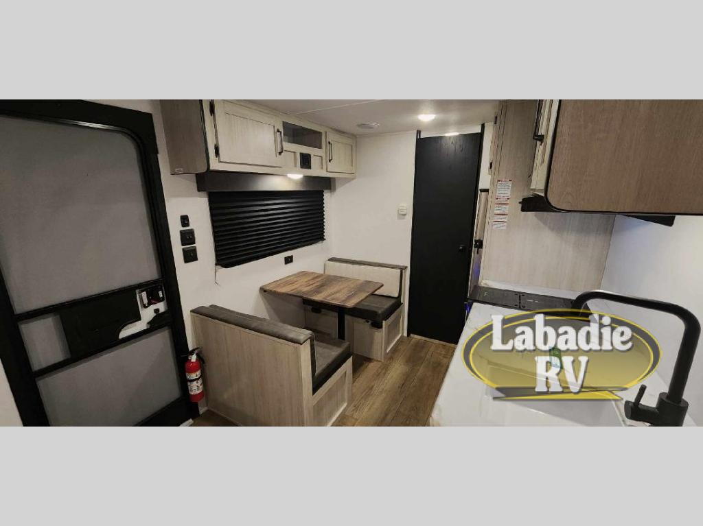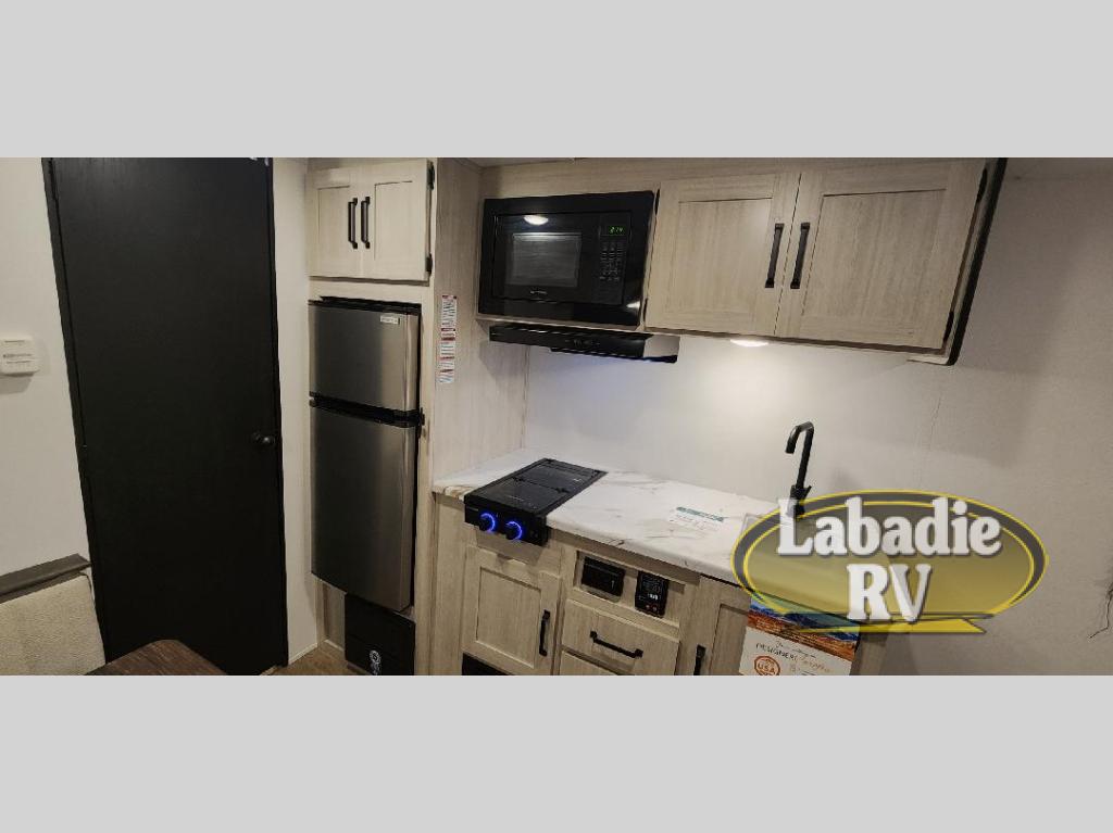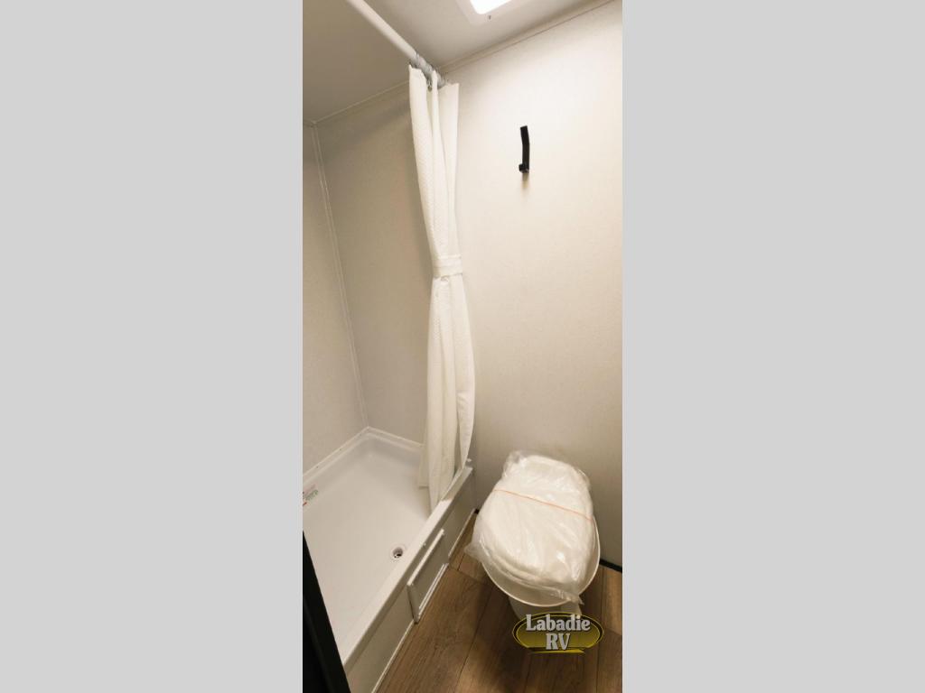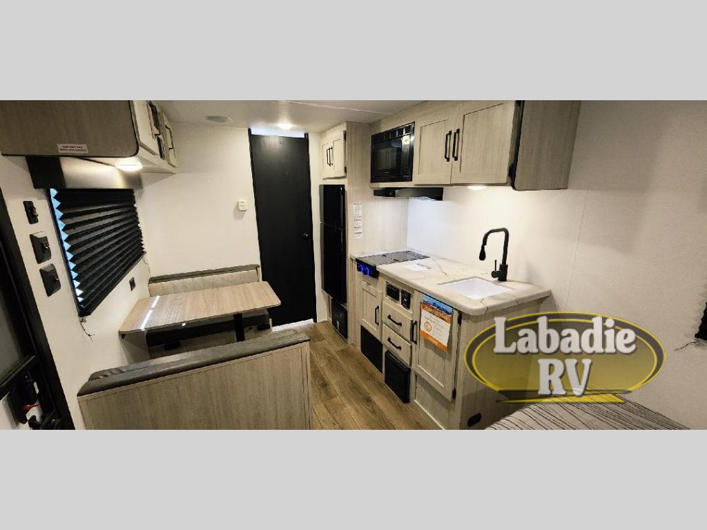 This single axle travel trailer is one you won't want to pass up! There is a front RV queen bed with a bedside shirt closet and overhead shelf for your things, and one more adult or two little ones can sleep on the booth dinette. A full kitchen includes a stainless two burner cooktop and microwave to cook meals each day, and the 12V black glass refrigerator will keep your food fresh. This model also includes a full rear bath with a toilet, sink, and 36" x 30" shower for easy cleaning up!