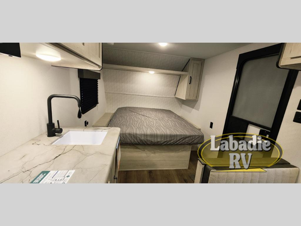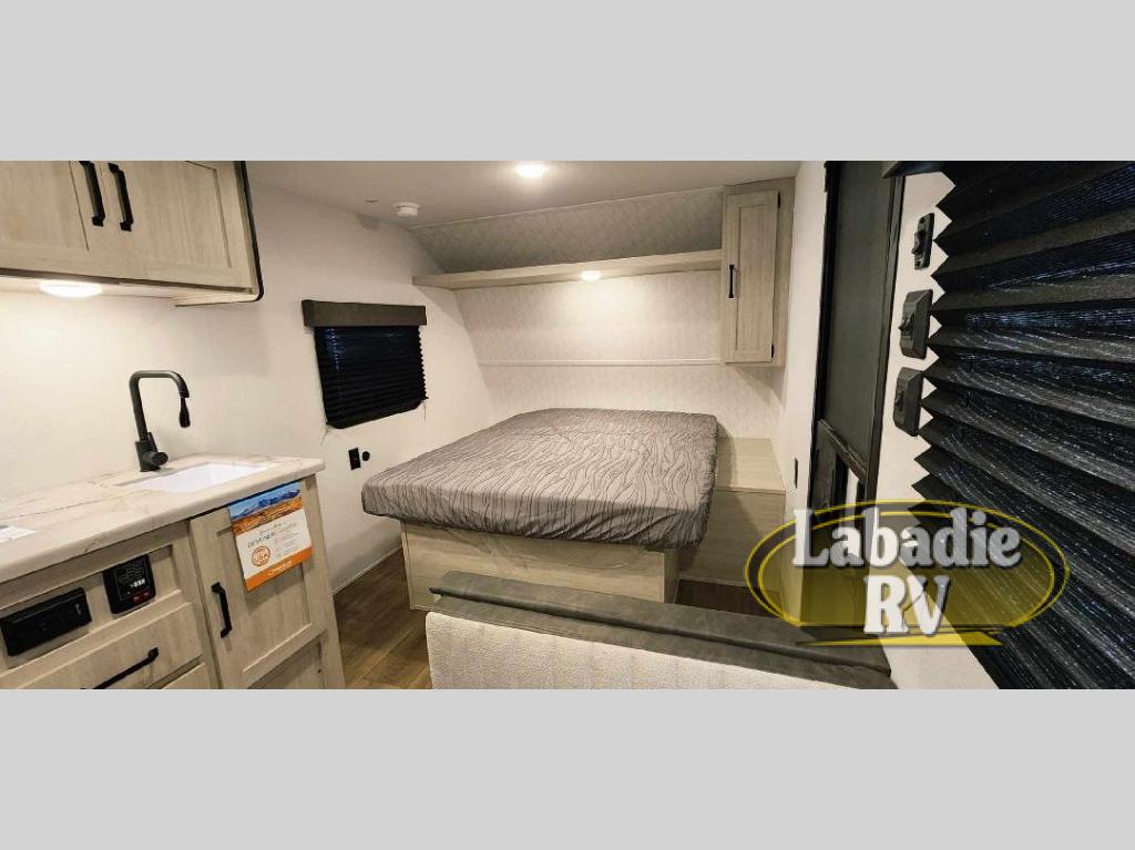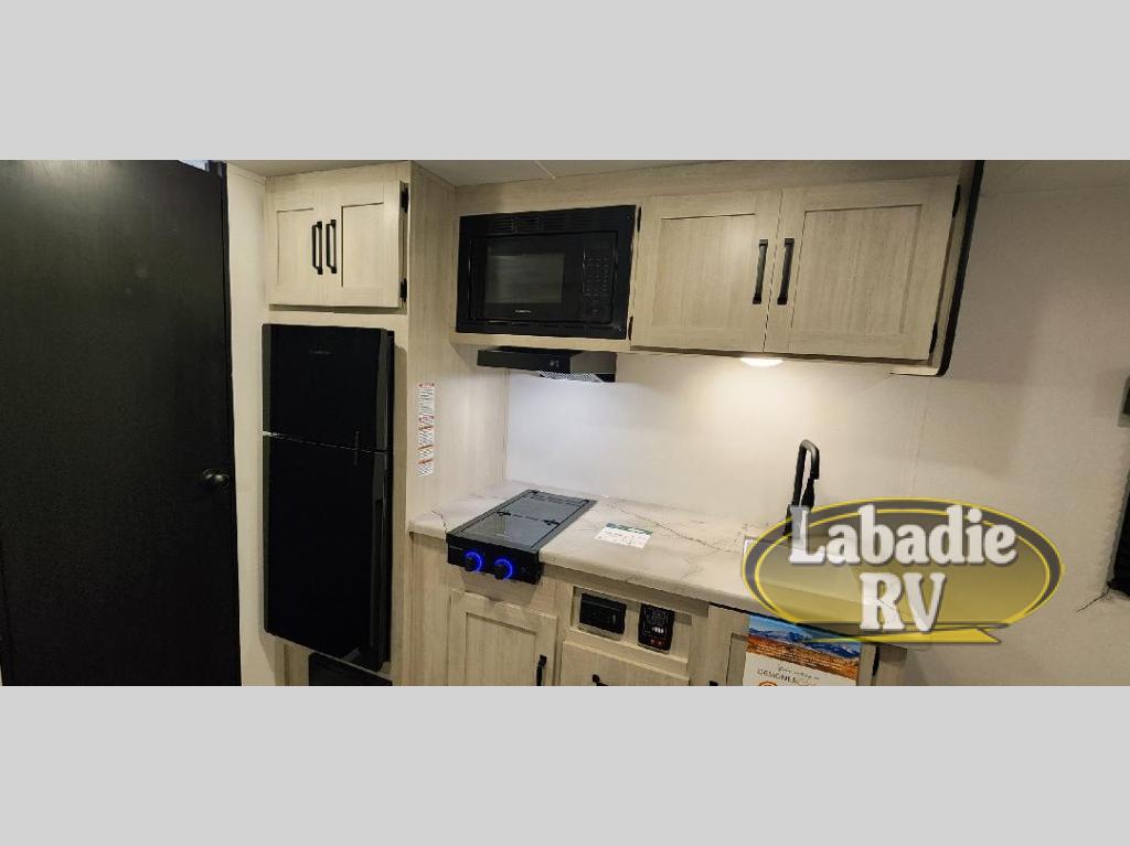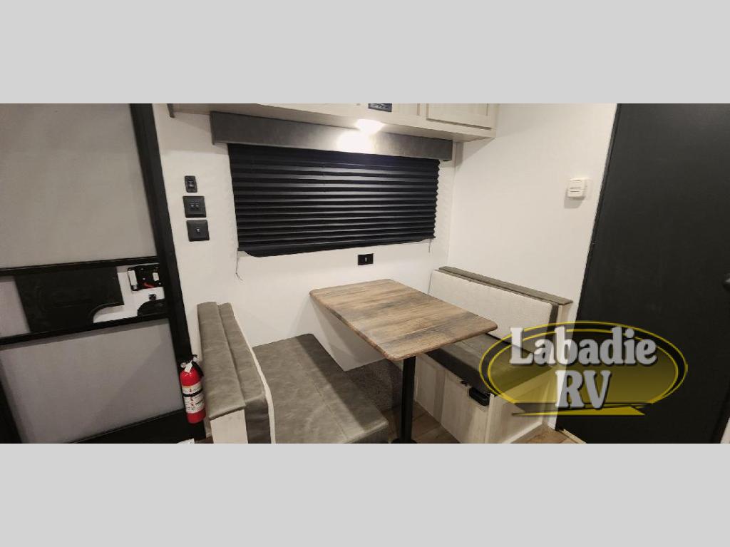 This single axle travel trailer is one you won't want to pass up! There is a front RV queen bed with a bedside shirt closet and overhead shelf for your things, and one more adult or two little ones can sleep on the booth dinette. A full kitchen includes a stainless two burner cooktop and microwave to cook meals each day, and the 12V black glass refrigerator will keep your food fresh. This model also includes a full rear bath with a toilet, sink, and 36" x 30" shower for easy cleaning up!