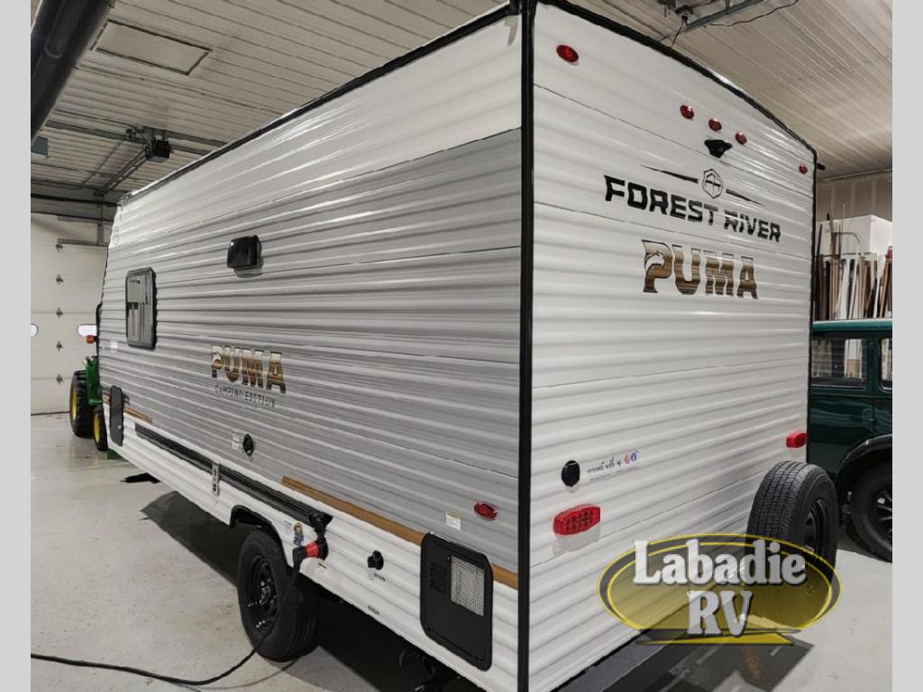 The Puma Camping Edition by Forest River offer an affordable travel trailer for rookie campers or seasoned RVers! They are built with 5/8" tongue and groove plywood flooring and a front diamond plate for added protection. There are also exterior magnetic baggage door latches, back up camera prep, a battery disconnect. Head inside to find Thermofoil countertops with a smooth drop edge, bedroom USB ports and outlets, and pleated shades in the living room.
