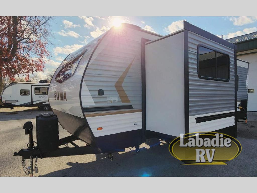 The Puma Camping Edition by Forest River offer an affordable travel trailer for rookie campers or seasoned RVers! They are built with 5/8" tongue and groove plywood flooring and a front diamond plate for added protection. There are also exterior magnetic baggage door latches, back up camera prep, a battery disconnect. Head inside to find Thermofoil countertops with a smooth drop edge, bedroom USB ports and outlets, and pleated shades in the living room.