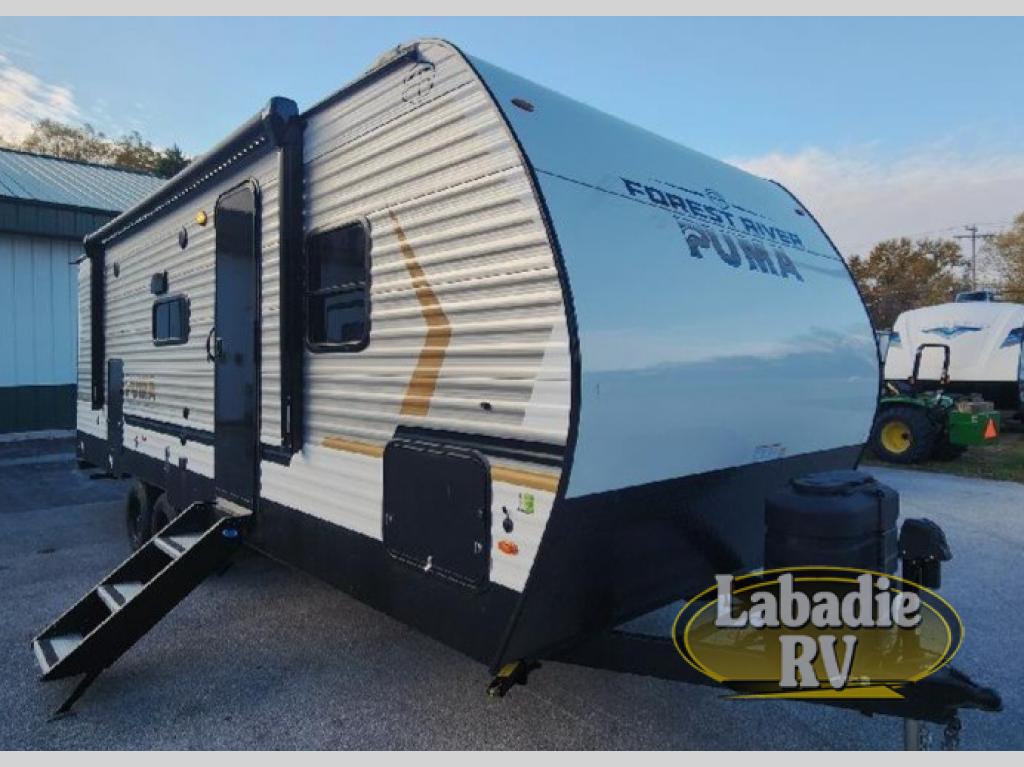 The Puma Camping Edition by Forest River offer an affordable travel trailer for rookie campers or seasoned RVers! They are built with 5/8" tongue and groove plywood flooring and a front diamond plate for added protection. There are also exterior magnetic baggage door latches, back up camera prep, a battery disconnect. Head inside to find Thermofoil countertops with a smooth drop edge, bedroom USB ports and outlets, and pleated shades in the living room.