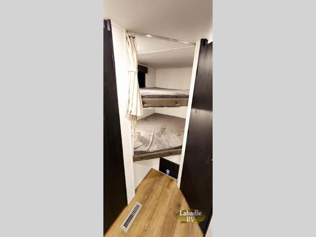 If you're looking for more space, this double axle unit features a large slide so you can walk about freely. Here, you'll find the booth dinette and sofa, which sit across from the optional TV if you want to enjoy movie nights. The full kitchen includes a microwave and three burner cooktop to make meals, plus a pantry and 12V refrigerator for food storage. There is even washer and dryer prep in the pantry if you choose to add these appliances. An optional outside mini kitchen can be added if you enjoy cooking outdoors! The kids or your guests will love the double-size bunks, and the full bath right beside the bunks includes a shower a seat for added comfort.