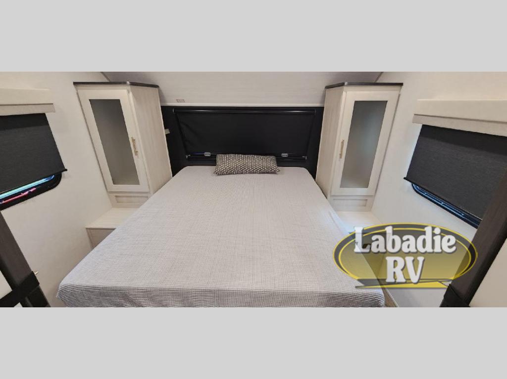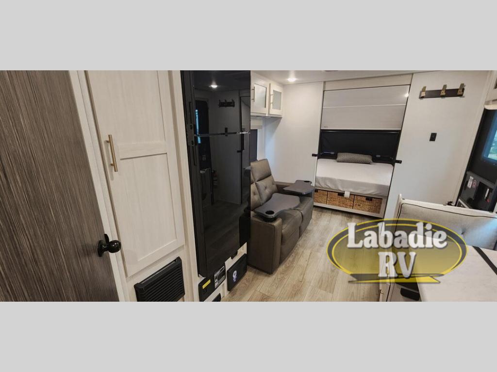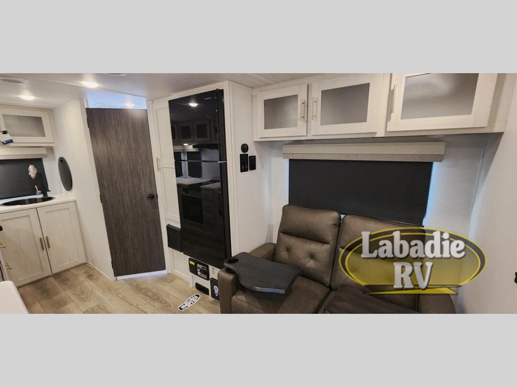 A private bedroom with a walk-around queen bed, a full bath, and sleeping space for guests are a few of the features that you are sure to want in your next RV! You can rest comfortably each night, plus all your clothing can be stored in the dual wardrobes to keep everything tidy. The chef of your group can make meals on the two burner cooktop or in the convection microwave, and there is a 12V black glass refrigerator for perishables. You can relax on the theater seat each evening, and if you're needing additional sleeping space, just choose the optional tri-fold sofa!