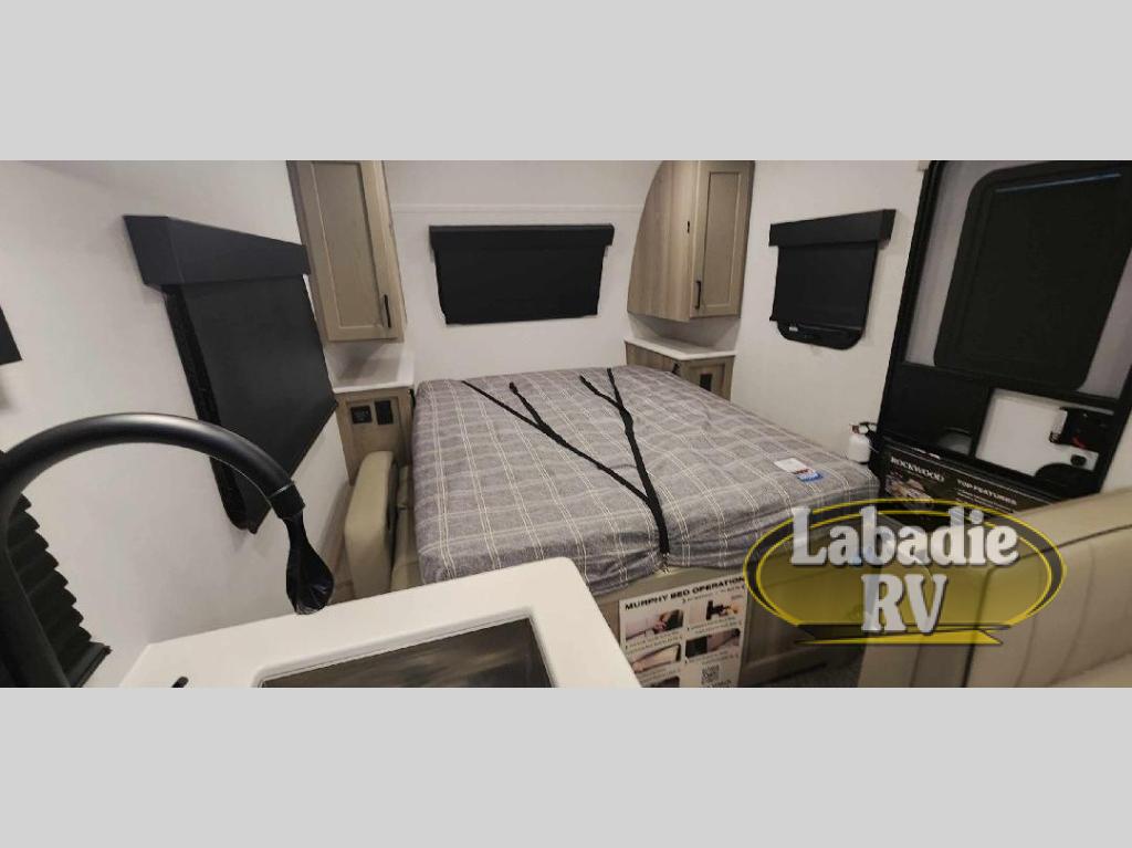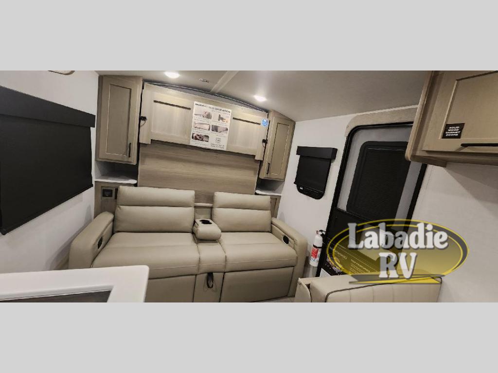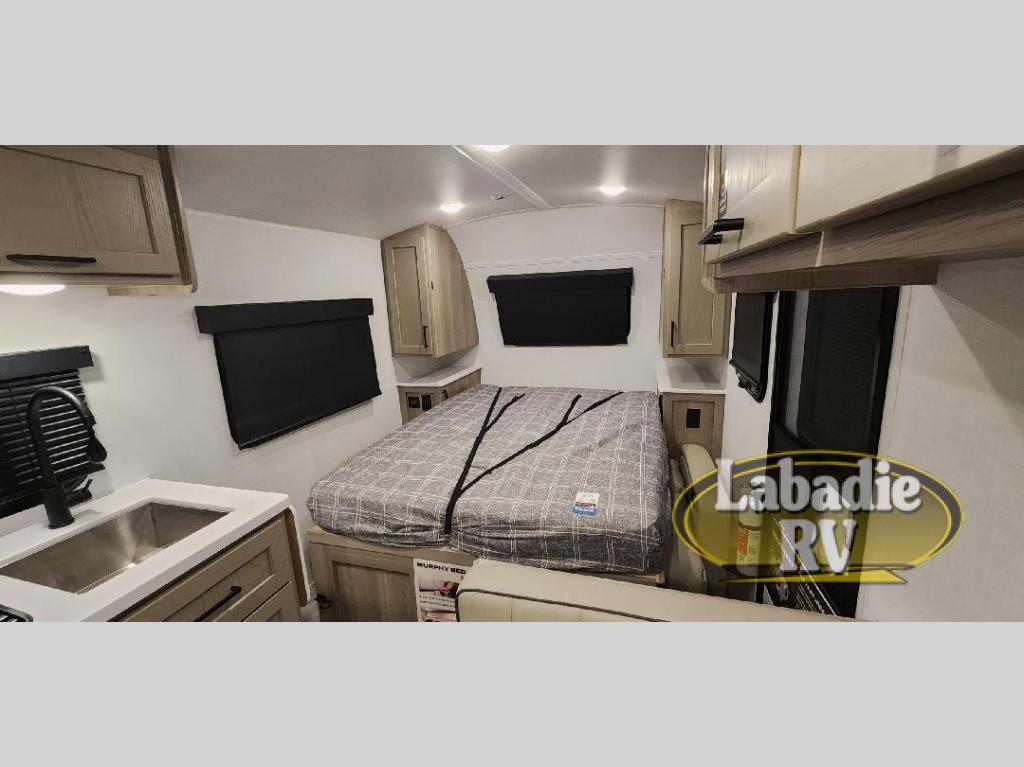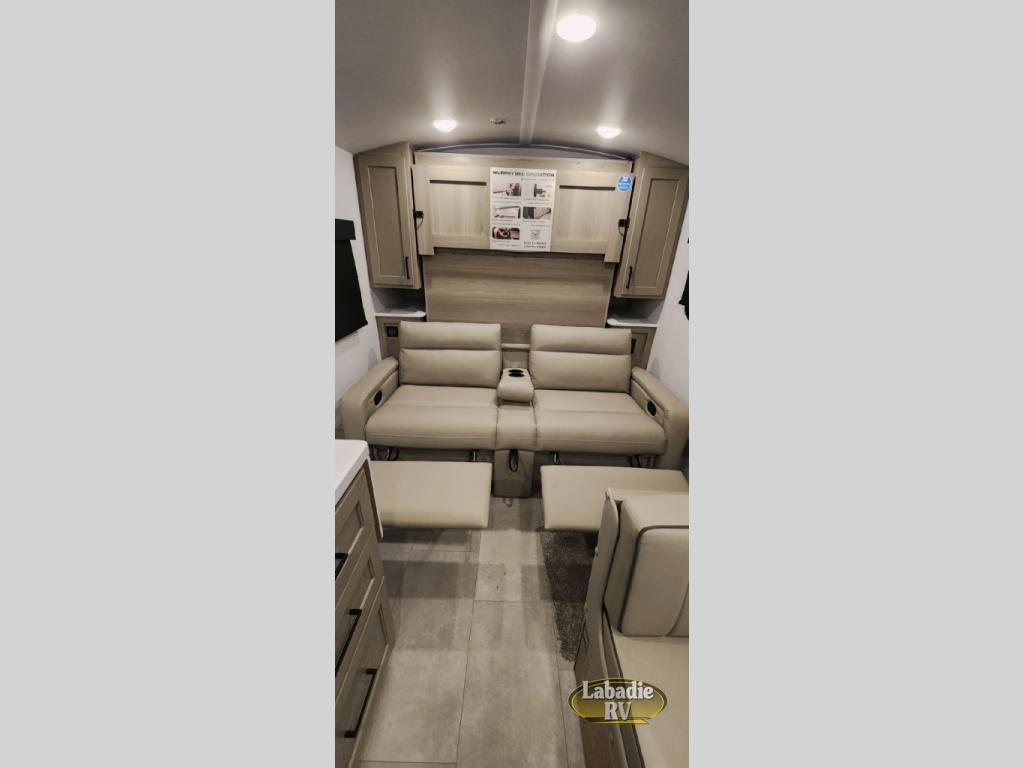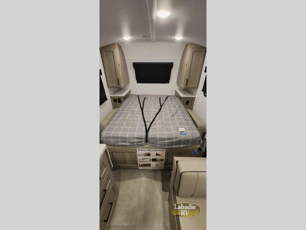 You will love how versatile this travel trailer is thanks to the Murphy bed up front. After you've had a great night's rest, just fold it up to relax on the 72" sofa. This will give the chef more space in the morning to prepare breakfast on the three burner cooktop or in the microwave oven. There is a 32" booth dinette to dine at, or you may just want to take your plate outdoors under the 14' power awning. The full rear bath includes a large linen closet to store clean towels. You will appreciate a pass-through storage, plus additional exterior storage so you can bring along hiking gear, water tubes, and fishing poles!