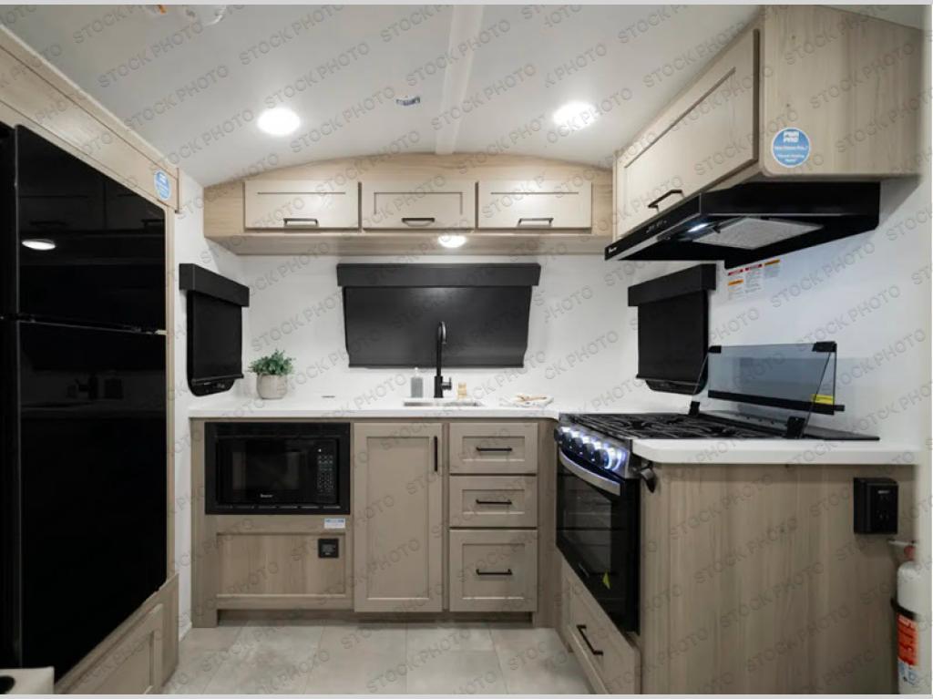Are you looking for a lightweight trailer with at-home comforts? Take a look at this single slide out unit that can sleep three to four each night. There is a queen-size bed in the back with a 26" x 80" flip-up bunk for cozy sleeping space, a 72" sofa with cupholders to relax on, plus a 12V TV for movie nights! The front kitchen includes a 12V refrigerator to store food, plus a microwave oven and a gas oven to cook meals each day.