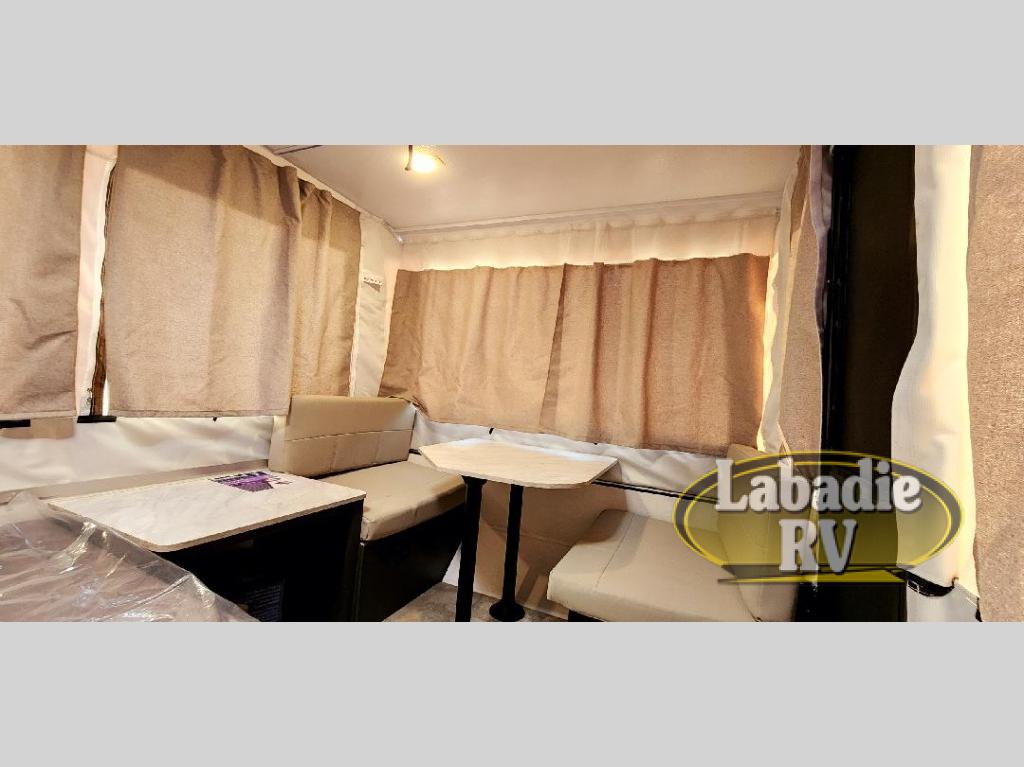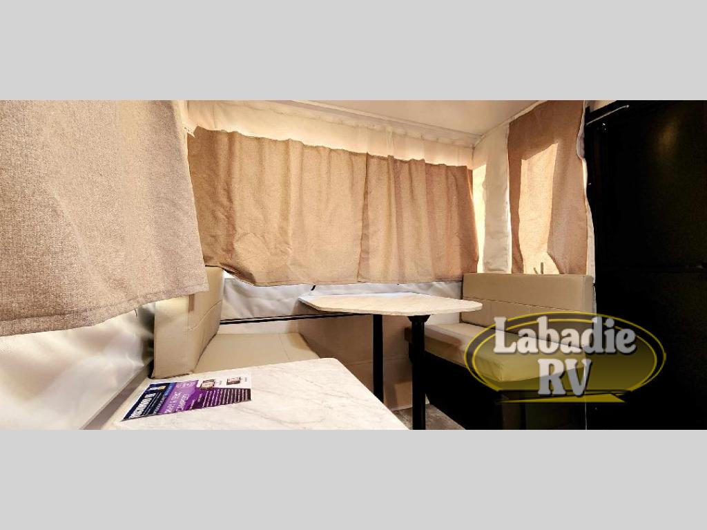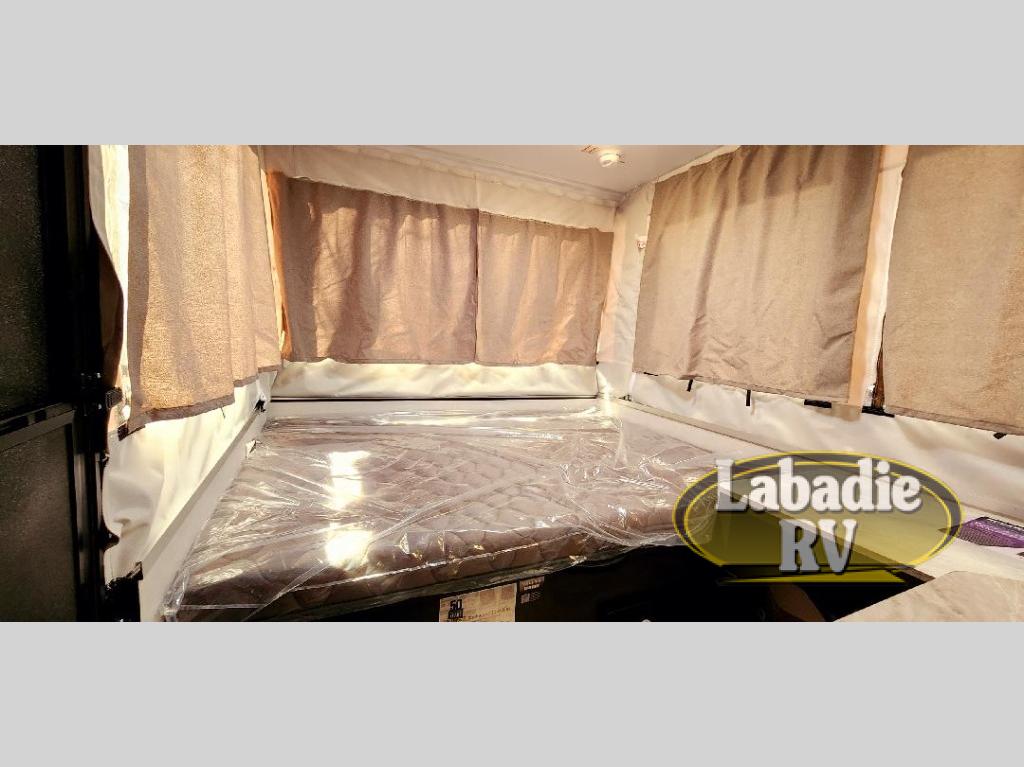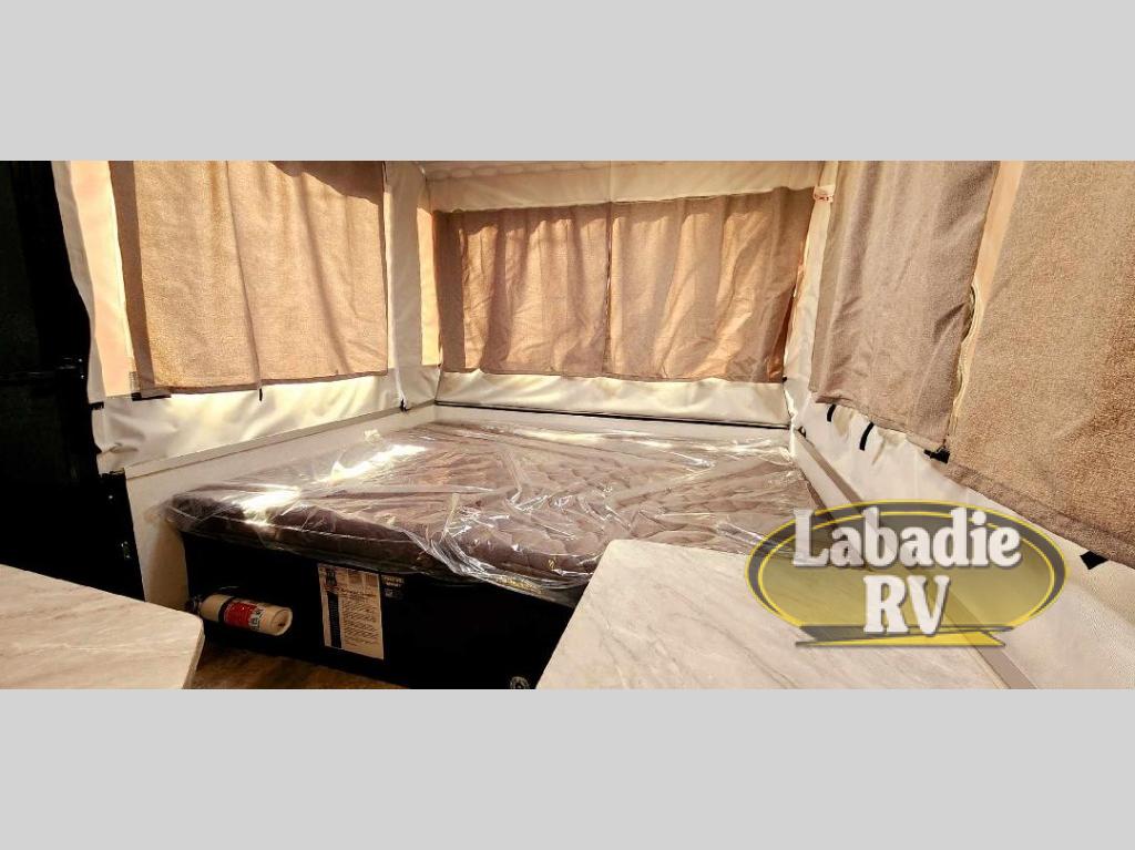 With any Rockwood OTG (Off The Ground) folding pop-up camper by Forest River, you will enjoy a more simple approach to outdoor fun. If you're a regular tent camper, but are looking for a little more comfort, then take a look at these easy-to-tow models! There are electric brakes, 12" radial tires, and Dexter sprung axles that provide that easy towing, and the clay fiberglass exterior is durable. A one-piece screen door also comes standard so you can let fresh air in, while keeping bugs out, and the LED interior lights will be an added benefit you didn't have while tent camping. Each model also includes residential style cabinet doors, wood look flooring, and an Andover Sable wood interior for a more outdoorsy feel!