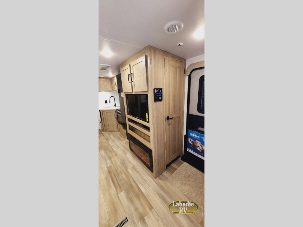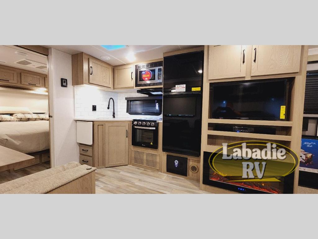 This trailer is the perfect couple's retreat with its private bedroom up front which includes a queen bed, a slide out wardrobe, and a TV option. The spacious rear full bathroom provides a shower and linen storage, and a space savings sliding door. The cook will have full amenities with ample counter space, a walk-in pantry for food storage, and a three burner range to cook meals on. If the weather is nice outside, you can make dinner on the exterior griddle, and there is a 21' awning to relax under. Or you can stay inside to enjoy the fireplace and Smart TV! You will also appreciate the pass thru storage with an optional steel sliding tray to easily access gear!