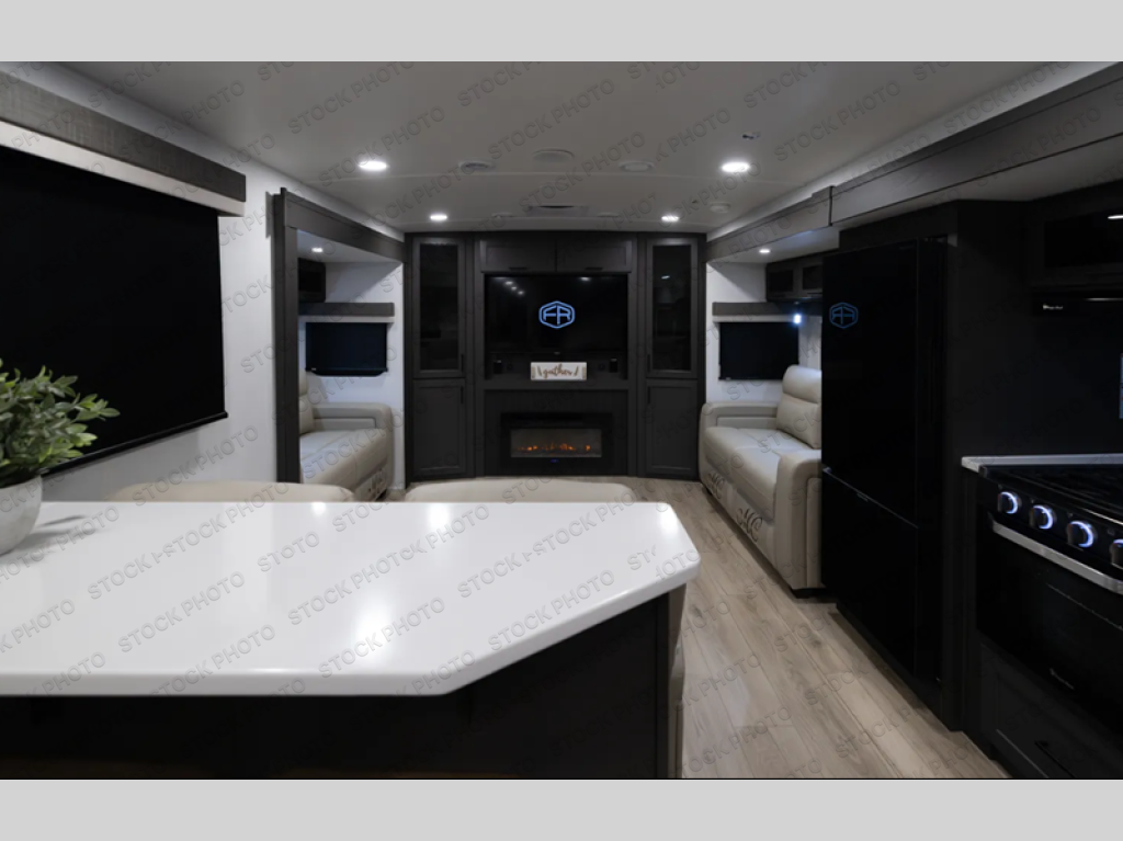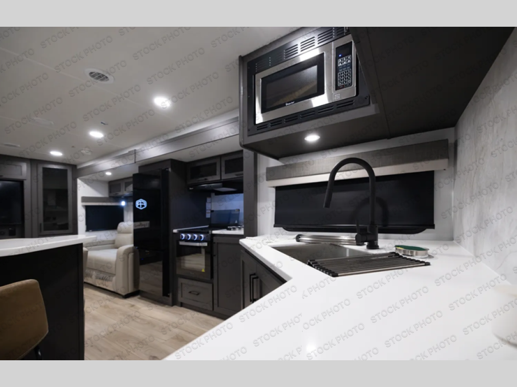 With dual slides at the rear, this Rockwood Ultra Lite travel trailer offers a spacious living area for entertaining or relaxing. Gather the whole gang for movie night with three cozy seating options facing the TV and fireplace, including two 60" hide-a-bed sofas and a 60" theater seat. A table with bar stools adds more seating and doubles as a dining spot, overlooking the TV. Overhead storage throughout the living area and kitchen provides plenty of room to stow away groceries, dishes, books, and board games, keeping everything organized. Let´s not forget the full bathroom with a large shower offers a comfortable place to refresh, while the front bedroom features a queen bed and two wardrobes for storing all your essentials.