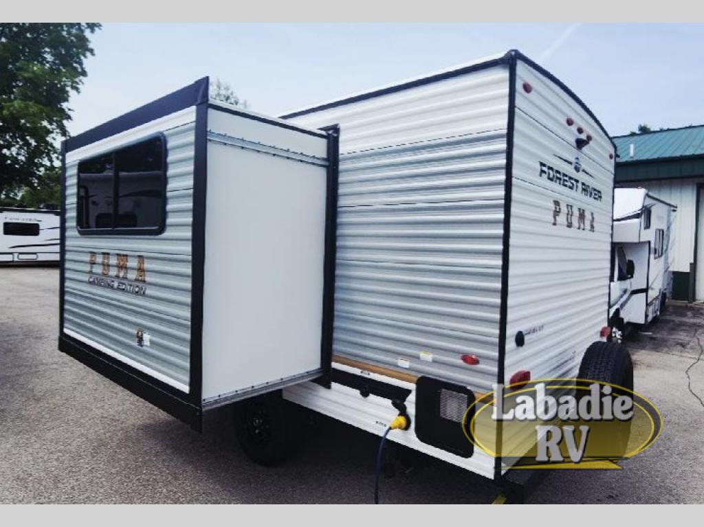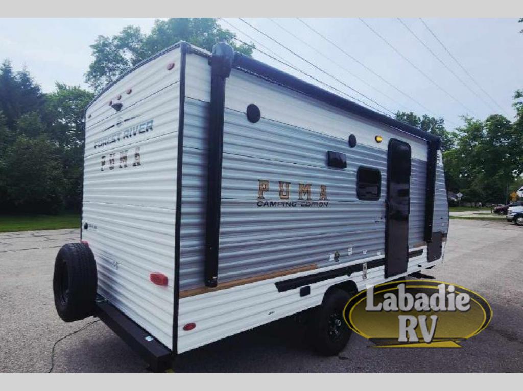 The Puma Camping Edition by Palomino offer an affordable travel trailer for rookie campers or seasoned RVers! They are built with 5/8" tongue and groove plywood flooring and a front diamond plate for added protection. There are also exterior clamp style door latches, back up camera prep, and 20 lb. LP bottles. Head inside to find Thermofoil countertops with a smooth drop edge, bedroom USB ports and outlets, and a GE appliance and kitchen package.
