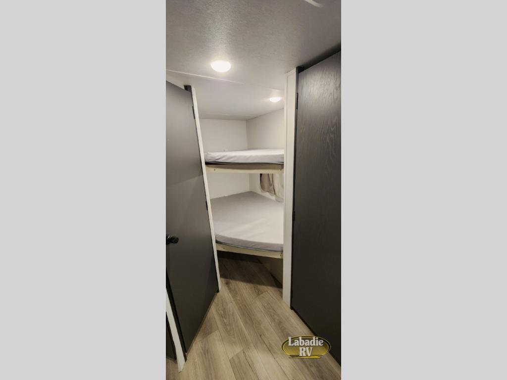 The double-size bunks found in this travel trailer will be perfect for guests, while you take the front RV queen bed! There is a full bath right beside the bunks for easy nighttime use, and the front bed includes a wardrobe at the foot of the bed for your things. Once the chef of your group has made lunch in the kitchen, you can dine at the dinette or take your plate outdoors to sit at the campground picnic table. There is also a kitchen pantry that is washer/dryer ready if you plan to add those appliances. This model also includes plenty of storage space, including an exterior storage compartment for fishing poles, hiking gear, and more!