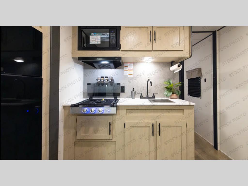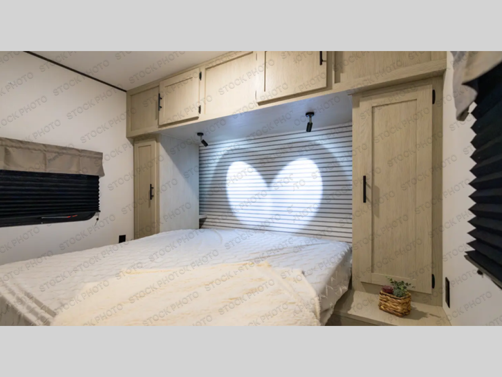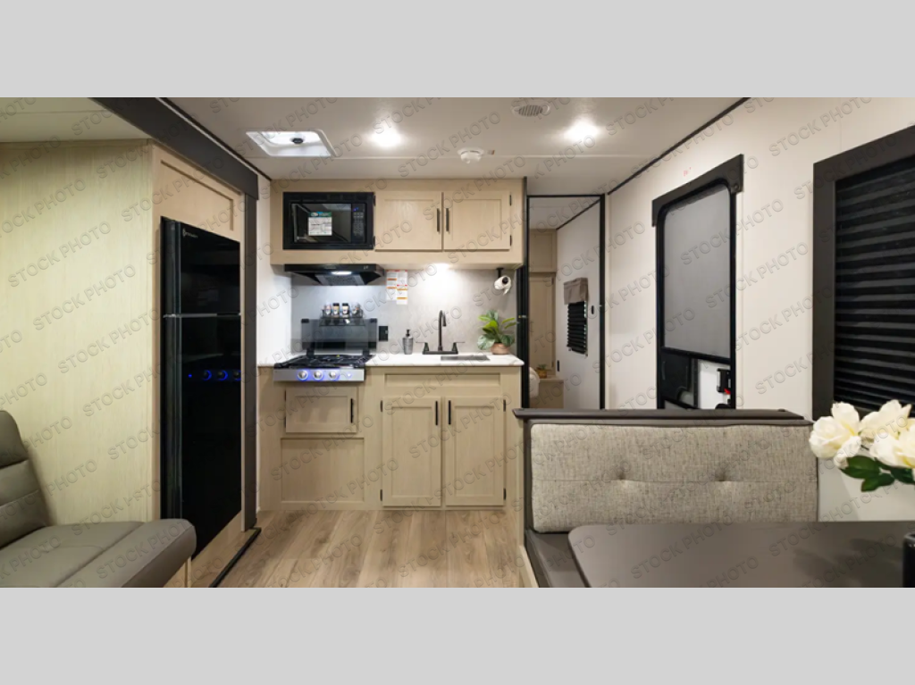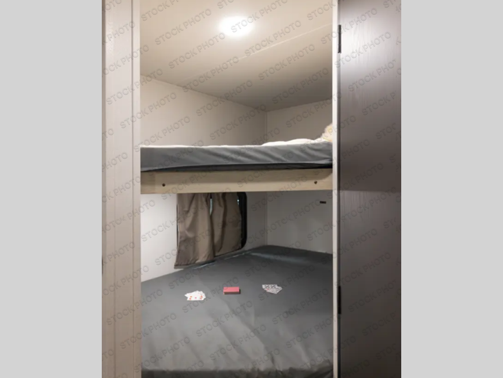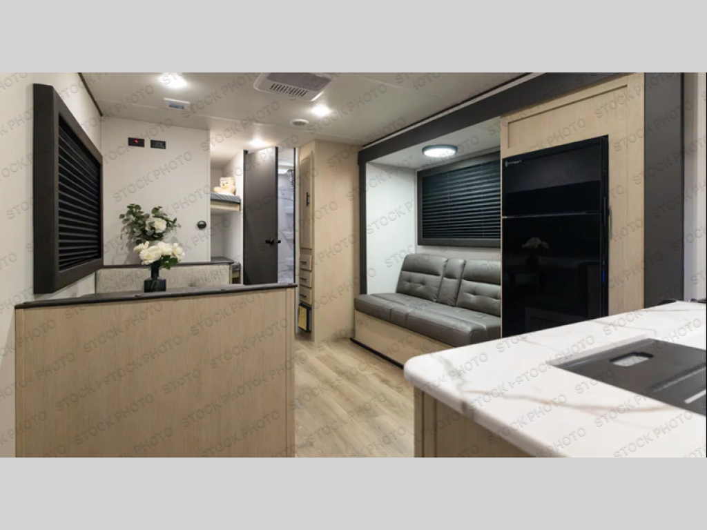 Your kids will love this travel trailer's double-size bunks that provide a cozy spot for children or guests, while the full bathroom offers convenience and comfort. The booth dinette is perfect for sharing meals with family or friends, and the pantry keeps your essentials organized. An entertainment center and sofa create a relaxing atmosphere to enjoy your favorite shows, and a refrigerator keeps your favorite snacks and drinks fresh. The front bedroom features a spacious queen bed, dual wardrobes, and shelves for ample storage. On the exterior, the pass-through storage provides additional space for gear or equipment, and an outside kitchen offers the perfect spot for alfresco cooking and entertaining.