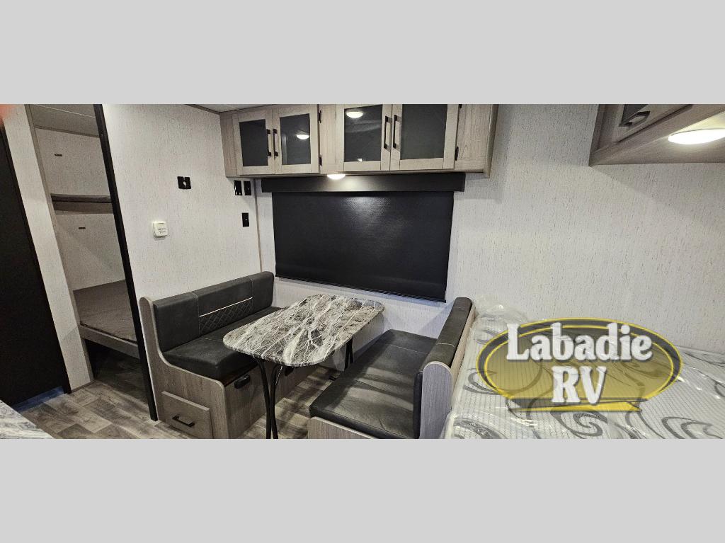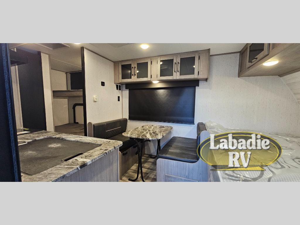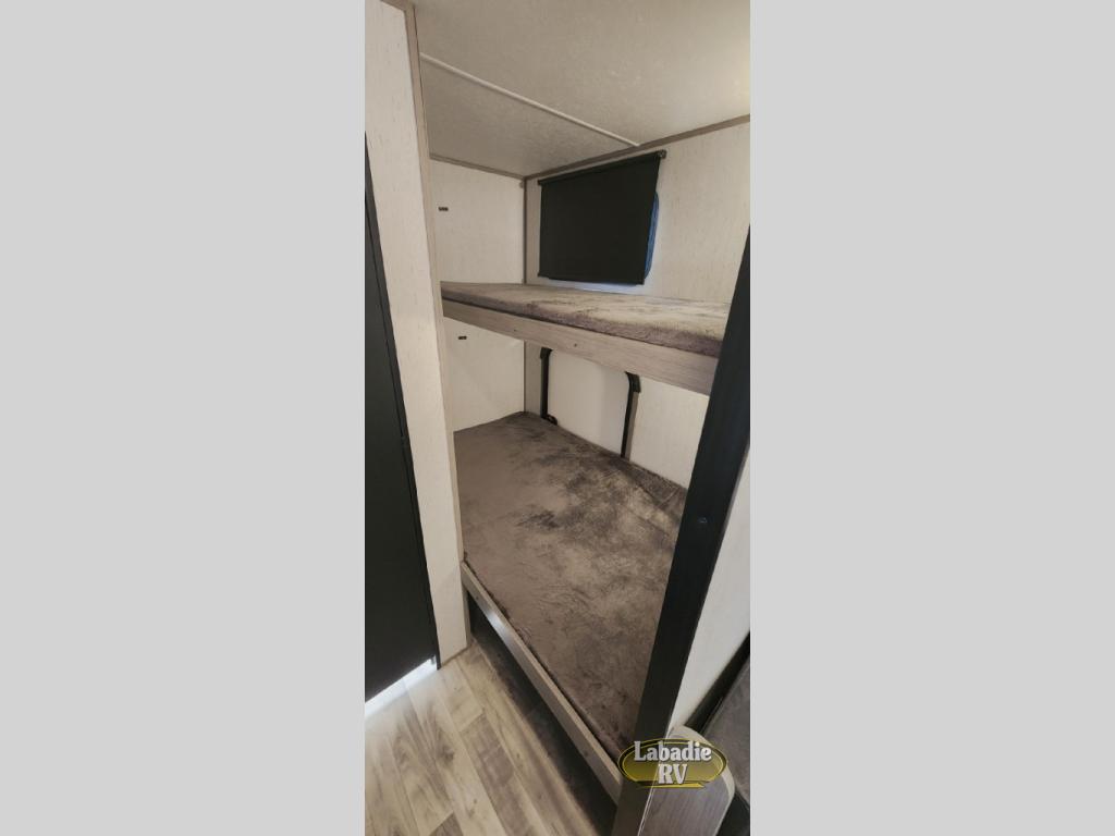 The whole gang will enjoy camping in this travel trailer! The kiddos or guests can sleep on the set of bunk beds and you can sleep on the front queen bed. After you prepare your best home cooked meals with the two burner range with a glass cover, you can head to the booth dinette to eat it. The booth dinette has an indoor/outdoor table for added versatility. Everyone will stay clean and fresh in the rear corner bathroom and the skylight above the shower will provide extra natural lighting as you get ready in the mornings. The exterior pass-through storage area is big enough for you to store all of your outdoor gear so you don't need to leave any behind!