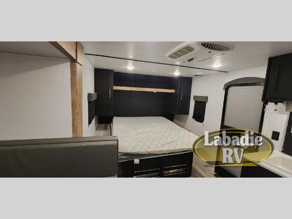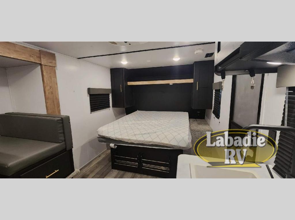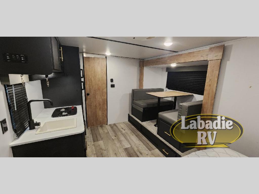 This is the perfect couple's RV with a walk-around queen bed up front with dual closets and nightstands, and a spacious rear bathroom. The galley kitchen offers a two burner cooktop and a sink to wash the dishes, plus there is 6 cu. ft. refrigerator for the cold items. You two can dine at the booth dinette slide which offers more floor space, plus there is drawer storage for your hand towels, pots and/or blankets. The 10' power awning provides protection so you can sit on your camping chairs while enjoying the outdoors.
