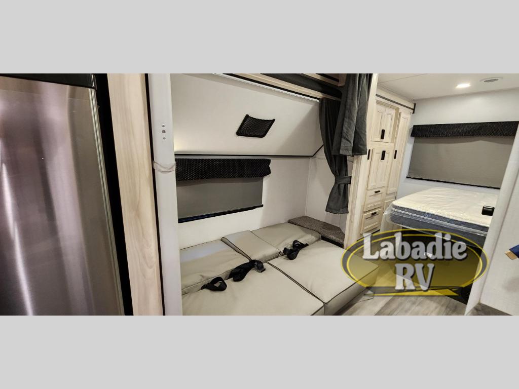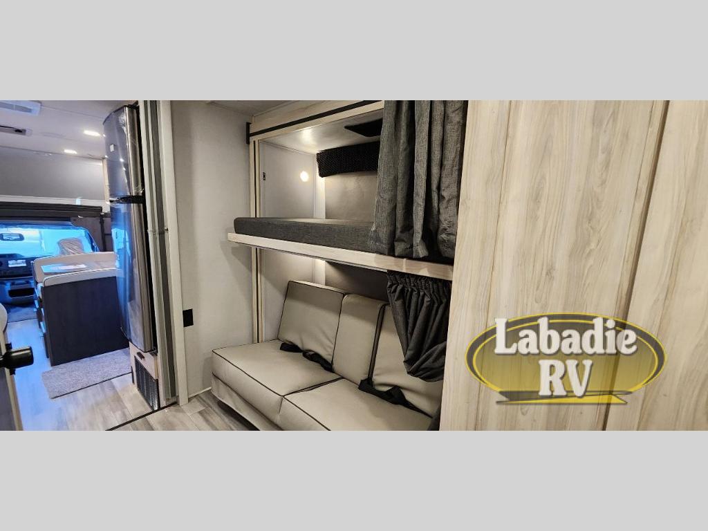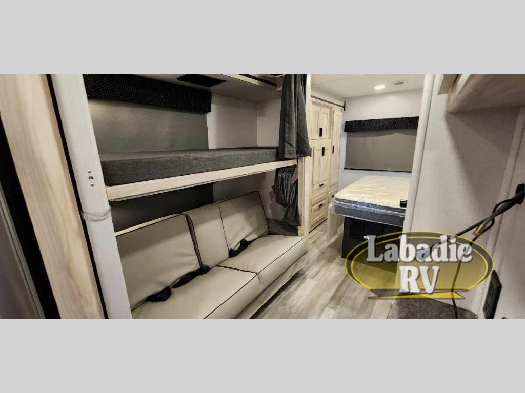 This family friendly coach allows the kids to have their own space either on the flip-down bunk above the kid's sofa sleeper that is across from the full bathroom or on the cab-over bunk. You will have the rear bedroom all to yourselves with a queen bed and a large wardrobe for your things. Everyone can visit while relaxing on the sofa and booth dinette while watching the LED TV or even while sitting under the 11' power awning outside when you add your camping chairs. The kitchen offers a corner area to make meals with a convection microwave and recessed three-burner range, plus a round sink and flip-up counter extension, and you can store cold items in the 10.7 cu. ft. 12V refrigerator near the entry, and the soft touch self-closing drawer guides and cordless 12V charging plate are features you will love.