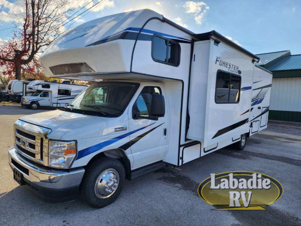 With any Forester LE Class C gas motorhome by Forest River, you will enjoy premier features such as the backup camera/side view cameras with a 3-way monitor, the Winegard Air 360+ digital antenna, and the 15,000 BTU ceiling ducted, ultra quiet roof air with a heat pump when traveling during the warmer months. The exterior includes aluminum framed laminated sidewalls, gel coat exterior fiberglass, a one-piece fiberglass front cap, and slide room toppers. Some of the interior top features are the Maxx Air multi-speed power fan with a cover in the kitchen, the high pressure oxygen infused shower head, and the blackout roller shades for a good night's sleep. Make your selection today!