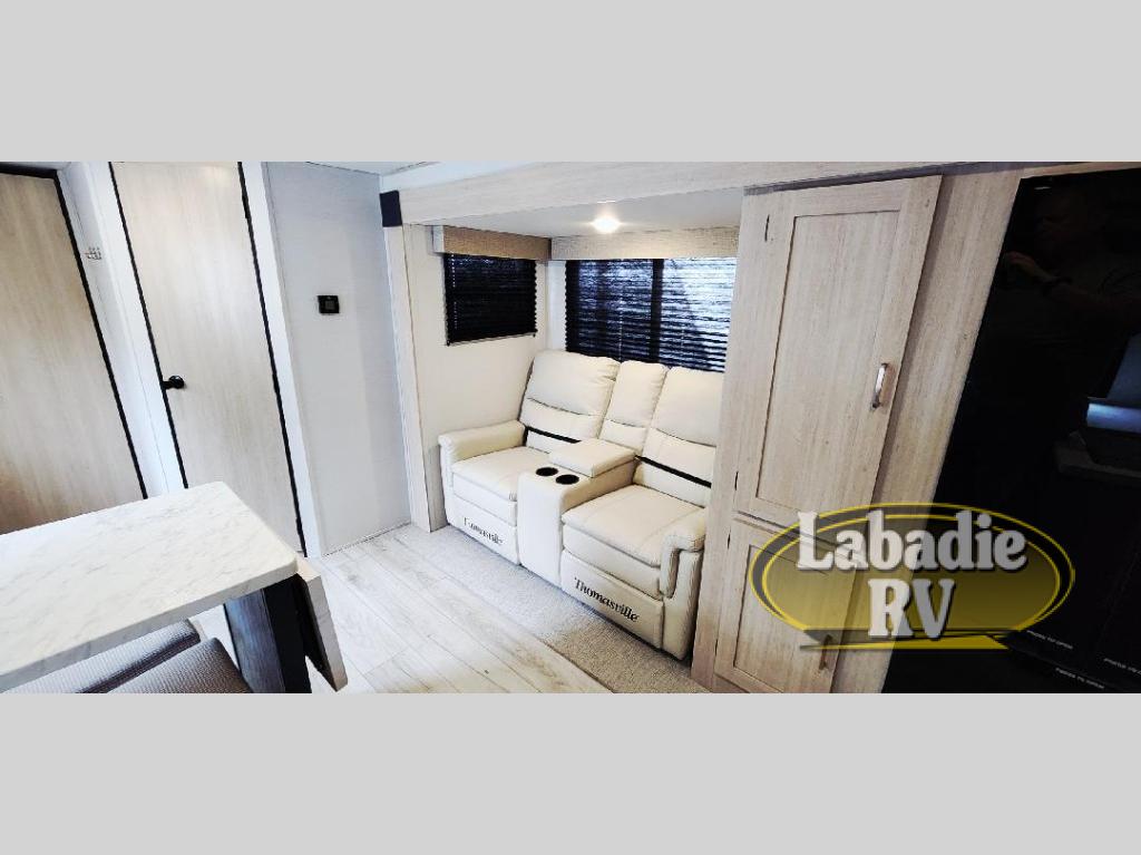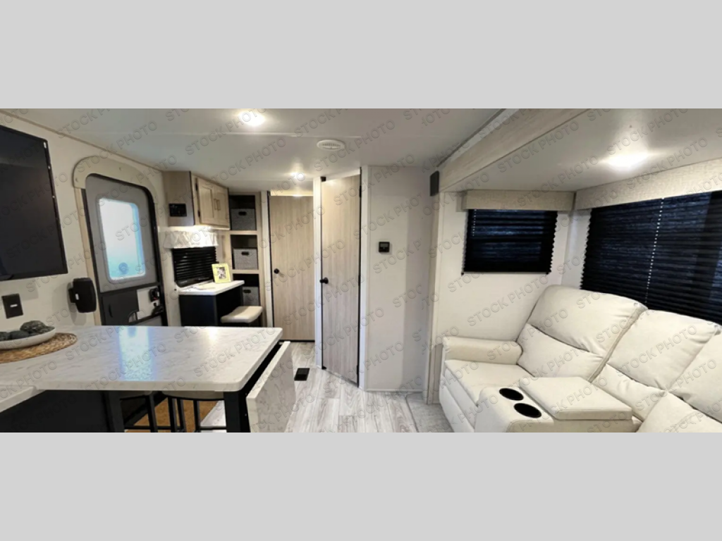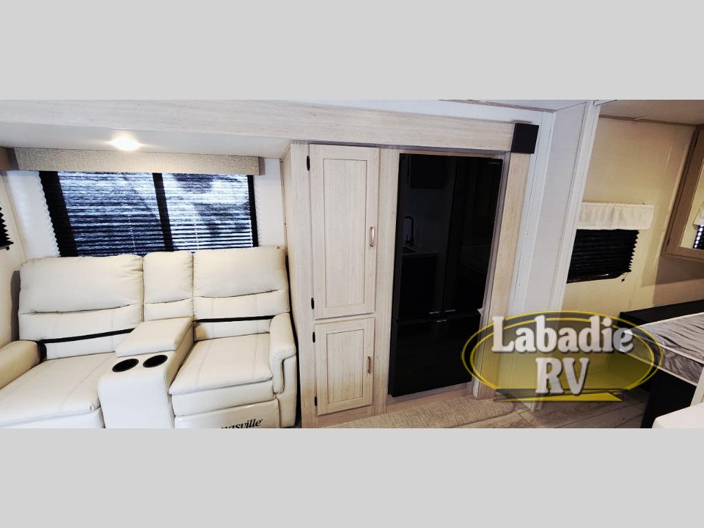 Head to your local state park in this spacious travel trailer! Once you arrive at the campground, you can grab a cold drink from the exterior refrigerator, then head inside to make lunch. An L-shaped counter with two chairs provides a place to enjoy your morning coffee at, or you may find yourselves on the theater seat within the large slide out. The French door refrigerator and pantry is also found here and can hold all your food for the week. You'll feel right at home in the front private bedroom that includes a queen bed, dual wardrobes, and an overhead cabinet for even more storage. This model also includes washer and dryer prep if you choose to add those appliances!