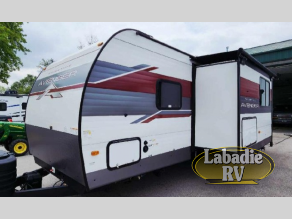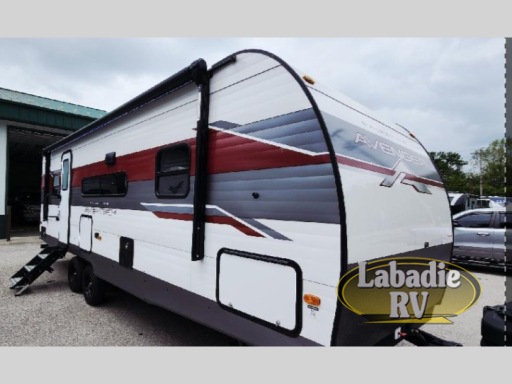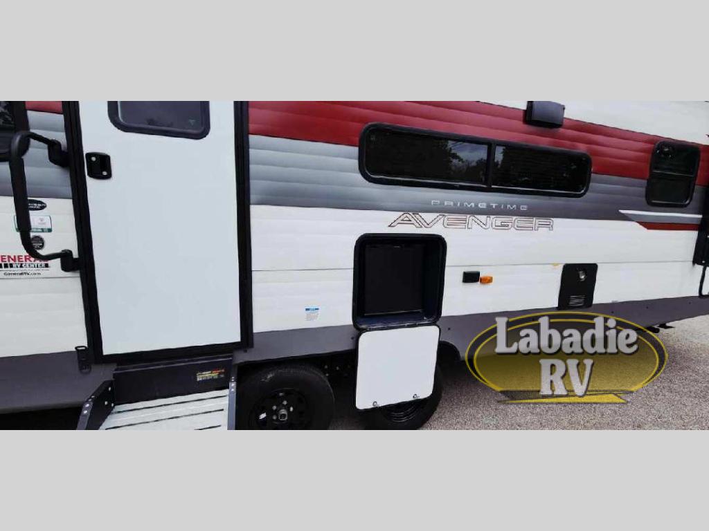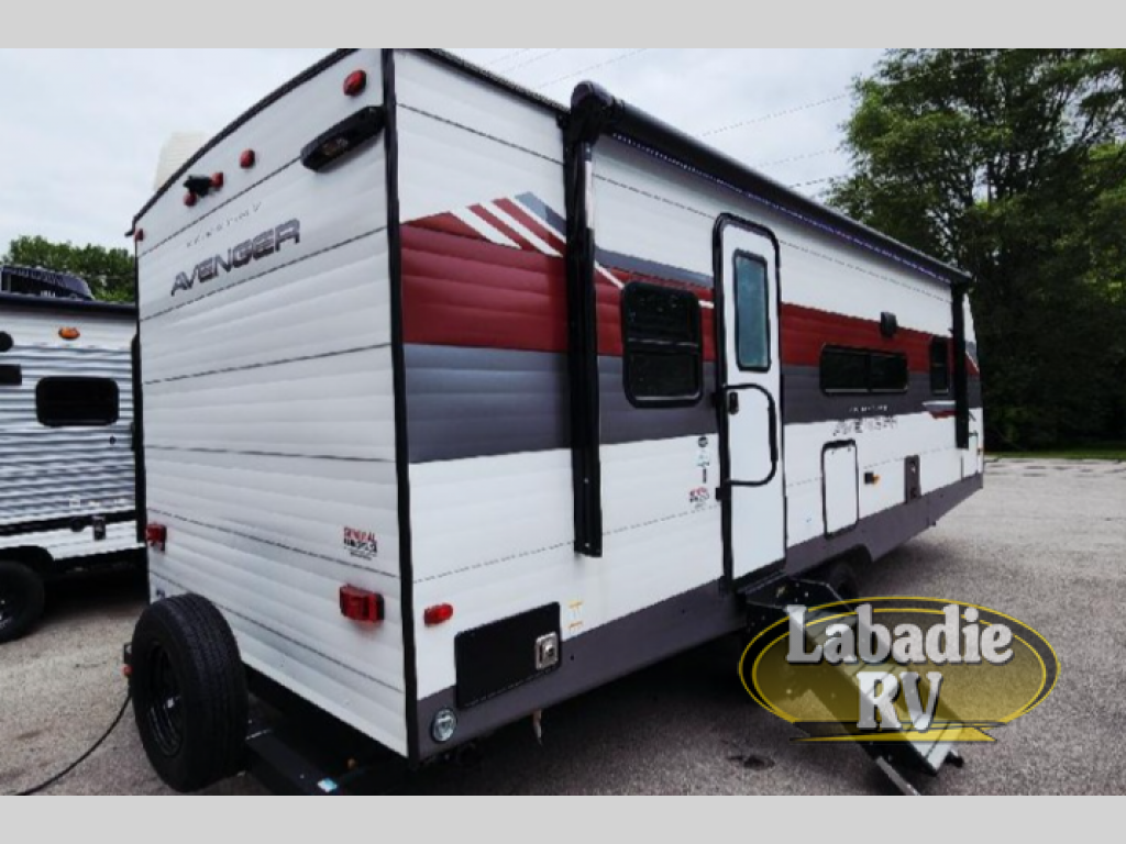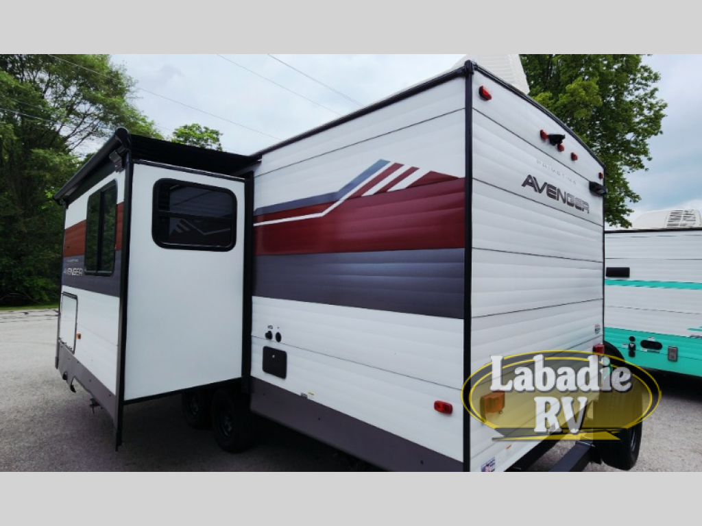 With any Avenger travel trailer by Prime Time, the exterior includes an aerodynamic smooth front metal, a diamond plate front rock guard for protection on the road, and four stabilizer jacks to keep your unit secure. There is a fully walkable roof plus an enclosed and heated underbelly that will help extend your camping season. The interior offers a 15,000 BTU air conditioner for the perfect climate inside, in-floor ducted heat, a systems monitor panel, and a Winegard 360+ antenna with Wi-Fi prep that will give you the option to stay connected as you camp. Each model also includes seamless Carefree Congoleum flooring, kitchen backsplash, shower pans in all models, and pleated nightshades throughout to name a few interior comforts!